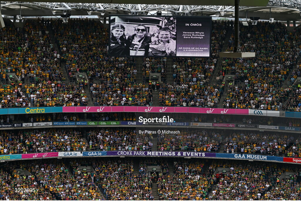 27 July 2025; An image of he late Vanessa Whyte, James Rutledge and Sara Rutledge are shown on the big screen during a minute's silence before the GAA Football All-Ireland Senior Championship final match between Kerry and Donegal at Croke Park in Dublin. Photo by Piaras Ó Mídheach/Sportsfile