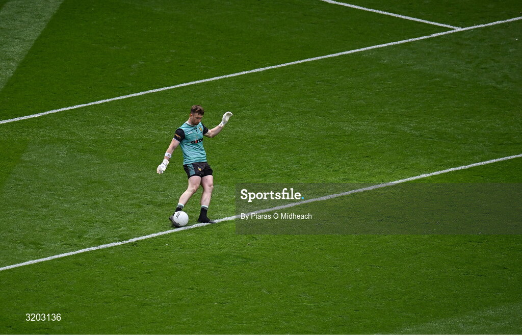 27 July 2025; Donegal goalkeeper Shaun Patton takes a kick-out during the GAA Football All-Ireland Senior Championship final match between Kerry and Donegal at Croke Park in Dublin. Photo by Piaras Ó Mídheach/Sportsfile