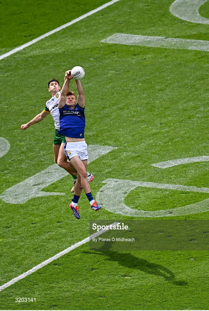 27 July 2025; Michael Langan of Donegal and Mark O'Shea of Kerry contest the throw-in at the start of the first half during the GAA Football All-Ireland Senior Championship final match between Kerry and Donegal at Croke Park in Dublin. Photo by Piaras Ó Mídheach/Sportsfile