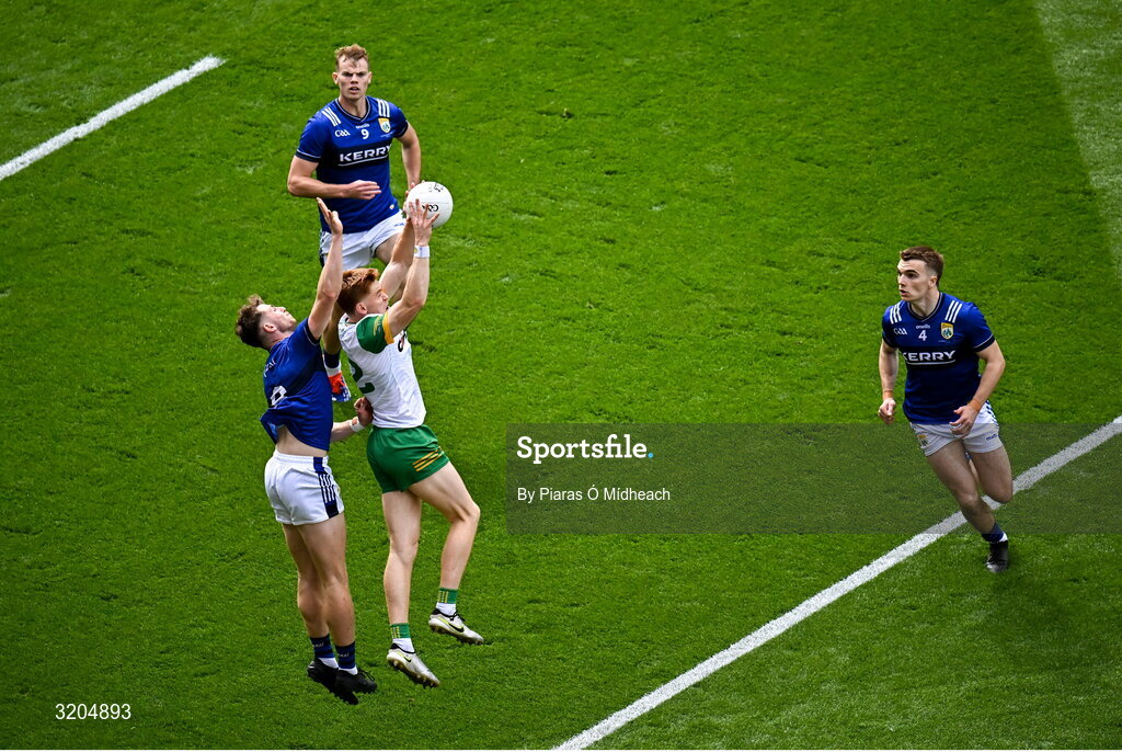 27 July 2025; Ciarán Moore of Donegal in action against Seán O'Brien of Kerry during the GAA Football All-Ireland Senior Championship final match between Kerry and Donegal at Croke Park in Dublin. Photo by Piaras Ó Mídheach/Sportsfile