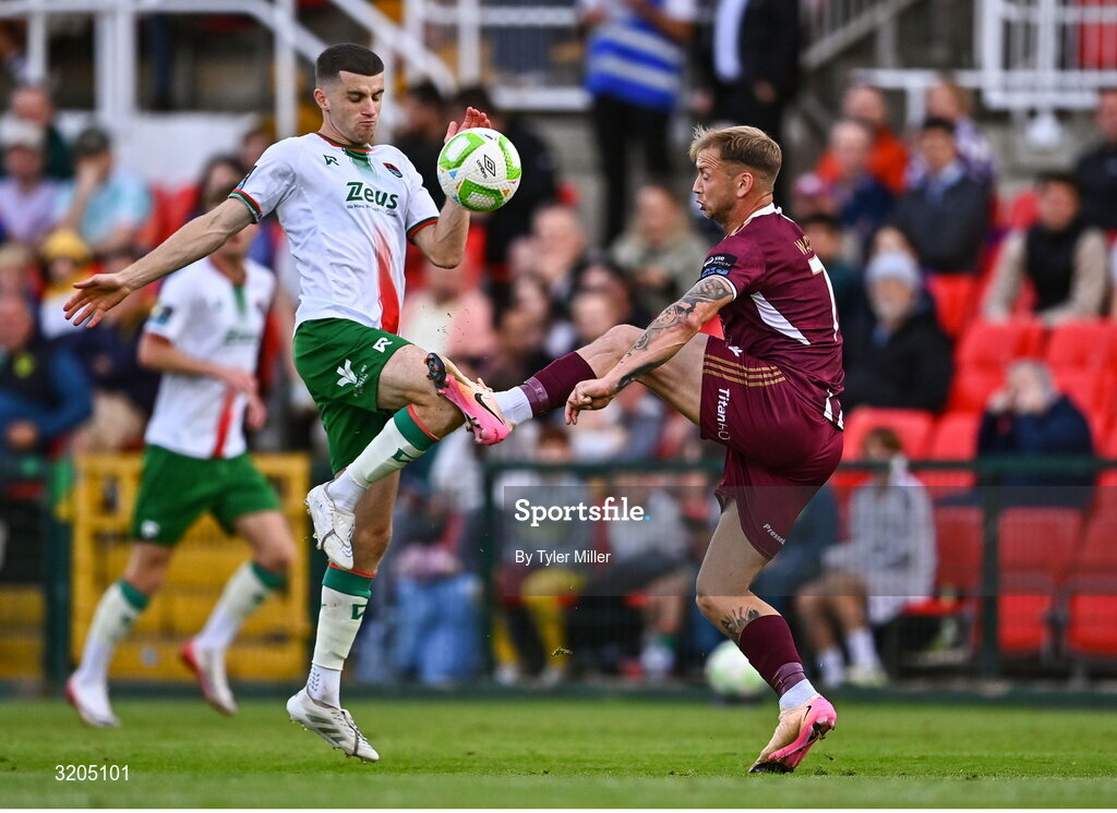 1 August 2025; Stephen Walsh of Galway United in action against Darragh Crowley of Cork City during the SSE Airtricity Men's Premier Division match between Cork City and Galway United at Turner's Cross in Cork. Photo by Tyler Miller/Sportsfile