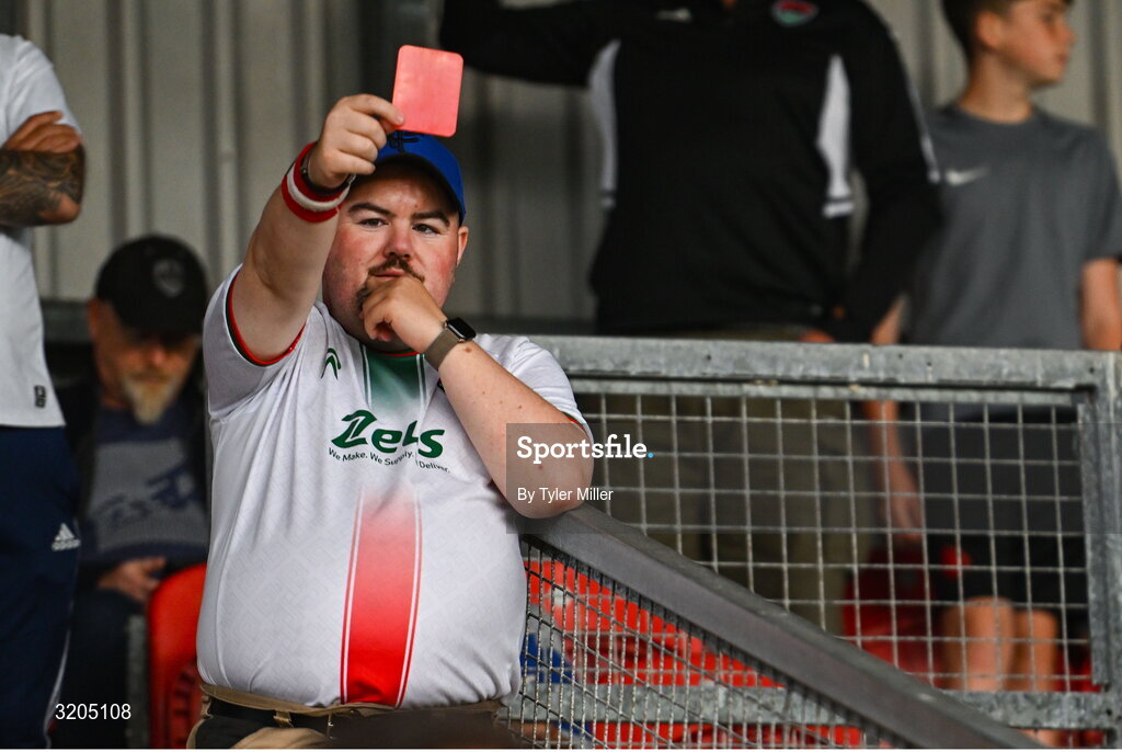 1 August 2025; A Cork City supporter holds up a red card towards Galway United supporters during the SSE Airtricity Men's Premier Division match between Cork City and Galway United at Turner's Cross in Cork. Photo by Tyler Miller/Sportsfile