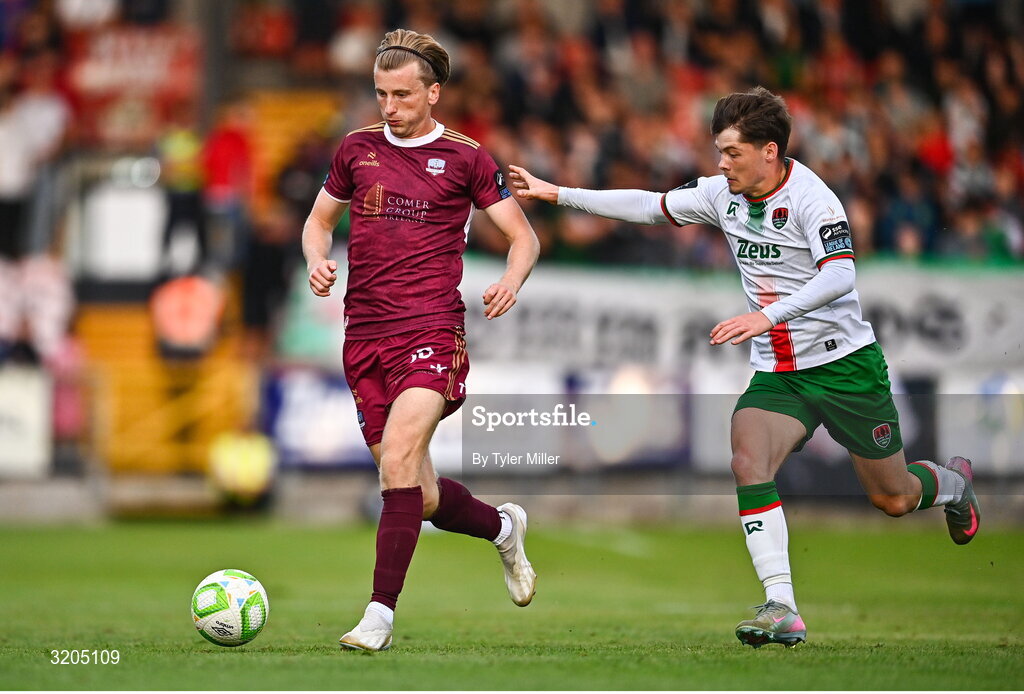 1 August 2025; David Hurley of Galway United in action against Kitt Nelson of Cork City during the SSE Airtricity Men's Premier Division match between Cork City and Galway United at Turner's Cross in Cork. Photo by Tyler Miller/Sportsfile