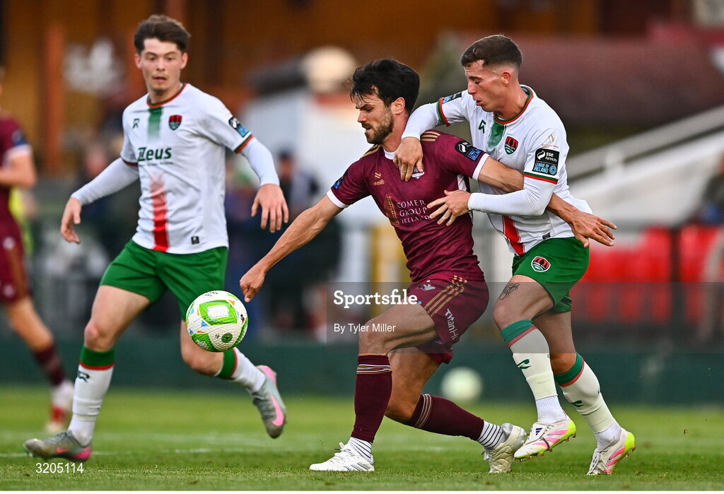 1 August 2025; Jimmy Keohane of Galway United in action against Evan McLaughlin of Cork City during the SSE Airtricity Men's Premier Division match between Cork City and Galway United at Turner's Cross in Cork. Photo by Tyler Miller/Sportsfile