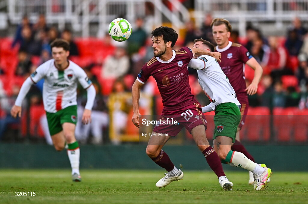 1 August 2025; Jimmy Keohane of Galway United in action against Evan McLaughlin of Cork City during the SSE Airtricity Men's Premier Division match between Cork City and Galway United at Turner's Cross in Cork. Photo by Tyler Miller/Sportsfile