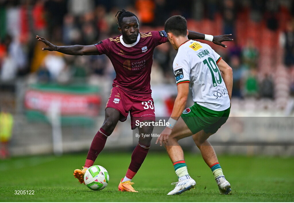 1 August 2025; Jeannot Esua of Galway United in action against Matthew Kiernan of Cork City during the SSE Airtricity Men's Premier Division match between Cork City and Galway United at Turner's Cross in Cork. Photo by Tyler Miller/Sportsfile