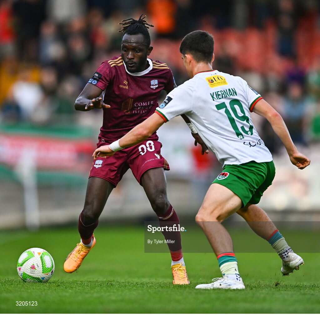 1 August 2025; Jeannot Esua of Galway United in action against Matthew Kiernan of Cork City during the SSE Airtricity Men's Premier Division match between Cork City and Galway United at Turner's Cross in Cork. Photo by Tyler Miller/Sportsfile