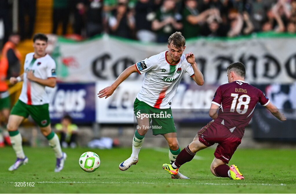 1 August 2025; Alex Nolan of Cork City is tackled by Robert Burns of Galway United during the SSE Airtricity Men's Premier Division match between Cork City and Galway United at Turner's Cross in Cork. Photo by Tyler Miller/Sportsfile