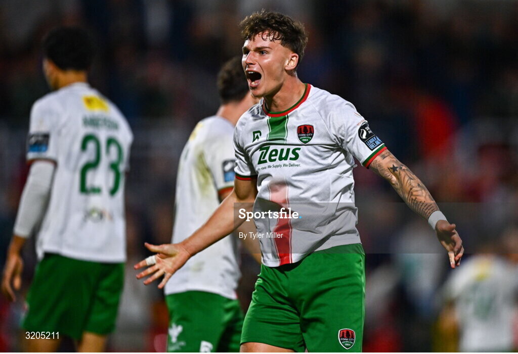 1 August 2025; Charlie Lutz of Cork City celebrates after the SSE Airtricity Men's Premier Division match between Cork City and Galway United at Turner's Cross in Cork. Photo by Tyler Miller/Sportsfile