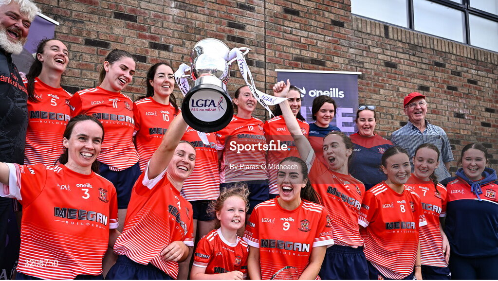 2 August 2025; Donaghmoyne, Monaghan, players celebrate after winning the Senior Championship Final at the O’Neills All-Ireland Club 7s competitions at Naomh Mearnóg GAA Club in Portmarnock, Dublin. Photo by Piaras Ó Mídheach/Sportsfile