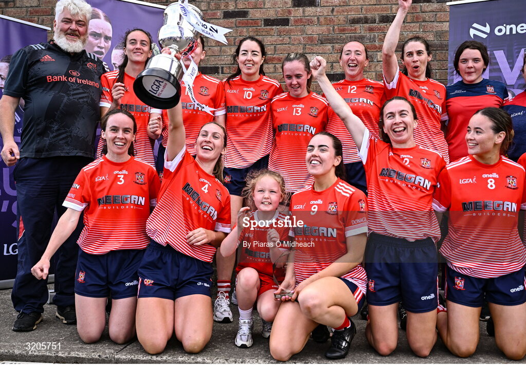 2 August 2025; Donaghmoyne, Monaghan, players celebrate after winning the Senior Championship Final at the O’Neills All-Ireland Club 7s competitions at Naomh Mearnóg GAA Club in Portmarnock, Dublin. Photo by Piaras Ó Mídheach/Sportsfile