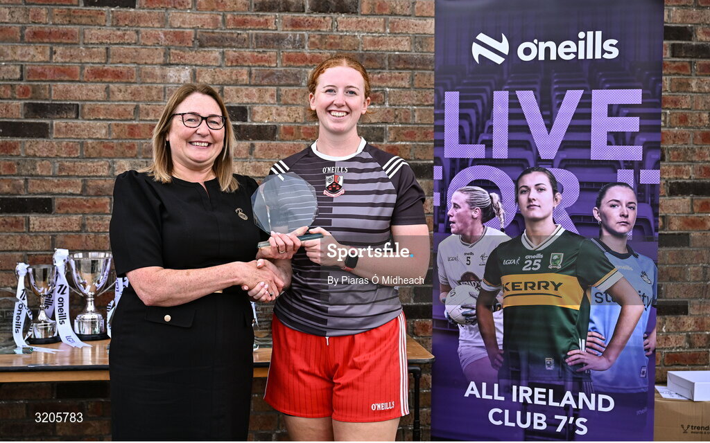 2 August 2025; LGFA President Trina Murray presents Sineád Kellett of Whitehall Colmcille GAA with the Junior Shield Runners-Up trophy at the O’Neills All-Ireland Club 7s competitions at Naomh Mearnóg GAA Club in Portmarnock, Dublin. Photo by Piaras Ó Mídheach/Sportsfile