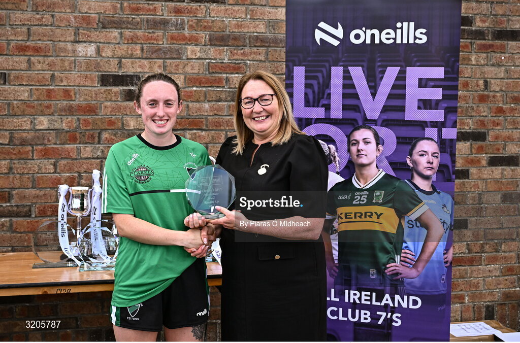 2 August 2025; LGFA President Trina Murray presents Aisling Kane of Pobal Parnells, Dublin, with the Intermediate Shield Runners-up trophy at the O’Neills All-Ireland Club 7s competitions at Naomh Mearnóg GAA Club in Portmarnock, Dublin. Photo by Piaras Ó Mídheach/Sportsfile