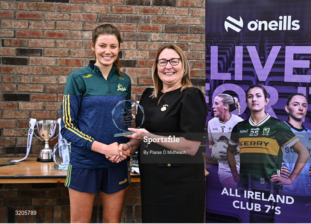 2 August 2025; LGFA President Trina Murray presents Clodagh Hanlon of Muckalee, Kilkenny, with the Junior Championship runners-up trophy at the O’Neills All-Ireland Club 7s competitions at Naomh Mearnóg GAA Club in Portmarnock, Dublin. Photo by Piaras Ó Mídheach/Sportsfile