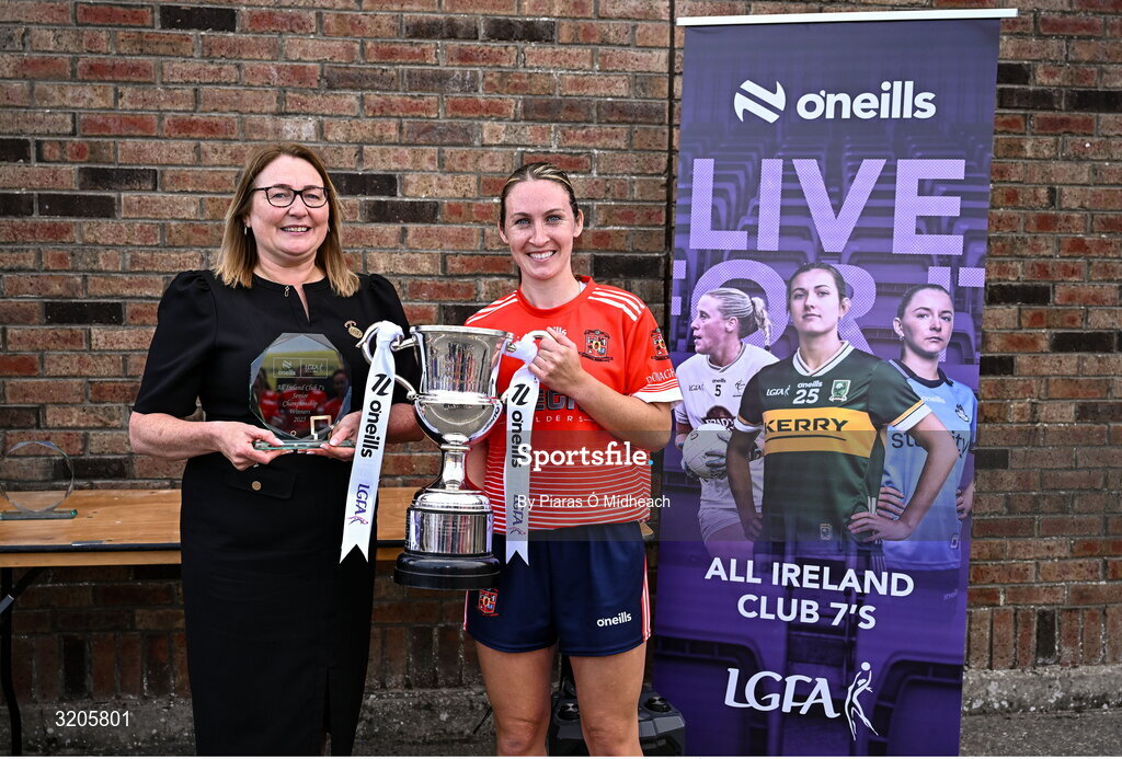 2 August 2025; LGFA President Trina Murray presents Rosemary Courtney of Donaghmoyne, Monaghan with the Senior Championship winners trophy at the O’Neills All-Ireland Club 7s competitions at Naomh Mearnóg GAA Club in Portmarnock, Dublin. Photo by Piaras Ó Mídheach/Sportsfile