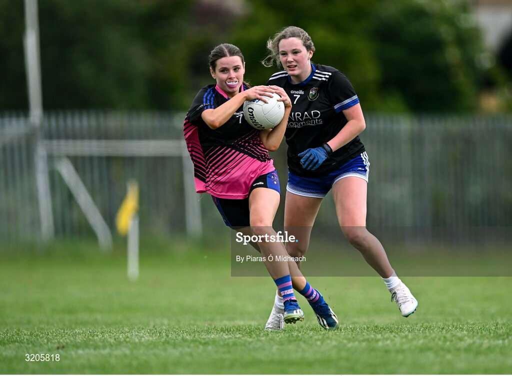 2 August 2025; Eva Donnellan of St Manchan's, Offaly, left, in action against Cumann Pheadair Naofa, Down, in the Intermediate competition at the O’Neills All-Ireland Club 7s competitions at Naomh Mearnóg GAA Club in Portmarnock, Dublin. Photo by Piaras Ó Mídheach/Sportsfile