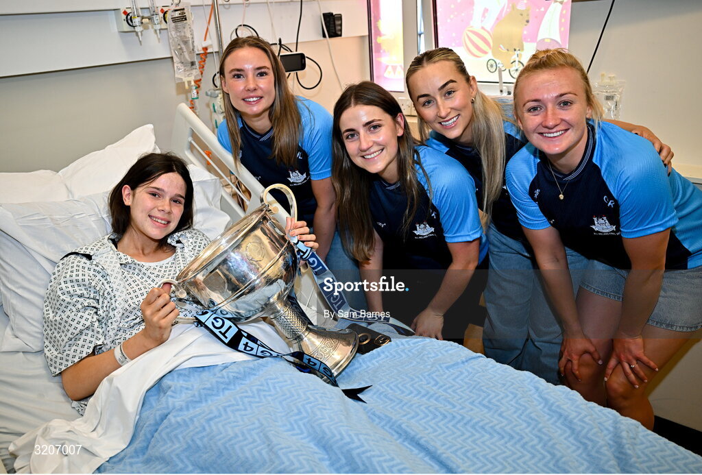 4 August 2025; TG4 All-Ireland Ladies Senior Football Champions and Dublin footballers Hannah Leahy, Aoife Kane, Aoife Curran and Carla Rowe pictured with the Brendan Martin Cup and Molly McEntaggart, aged 15, from Naas, Kildare, during a visit by the players to Children's Health Ireland at Crumlin, Dublin. Photo by Sam Barnes/Sportsfile