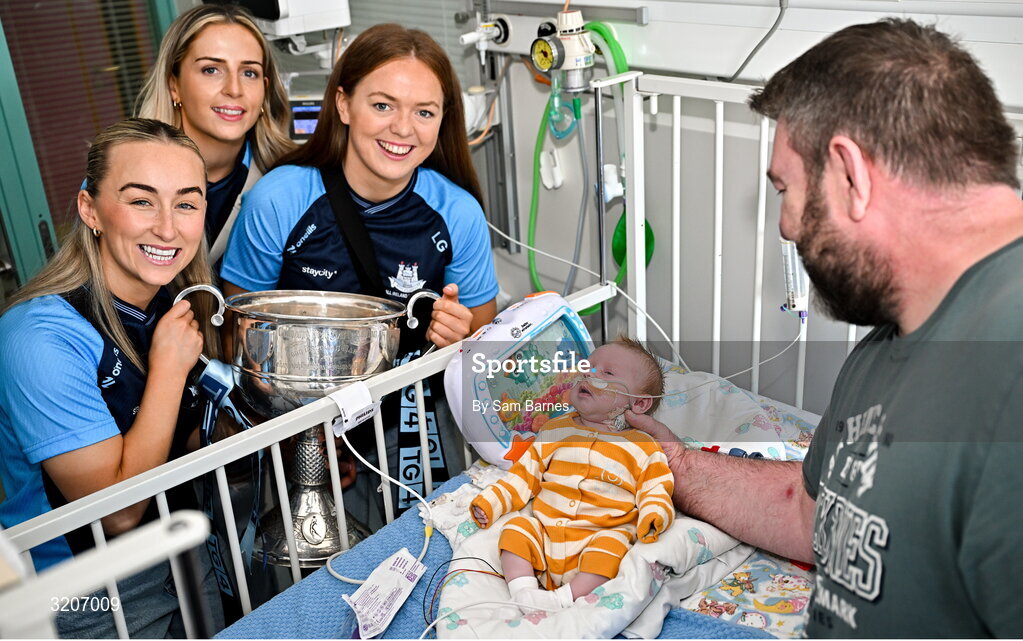 4 August 2025; TG4 All-Ireland Ladies Senior Football Champions and Dublin footballers Aoife Curran, Rebecca McDonnell and Laura Grendon pictured with the Brendan Martin Cup and Billie Madden, aged 4 weeks, and his father Willie, during a visit by the players to Children's Health Ireland at Crumlin, Dublin. Photo by Sam Barnes/Sportsfile