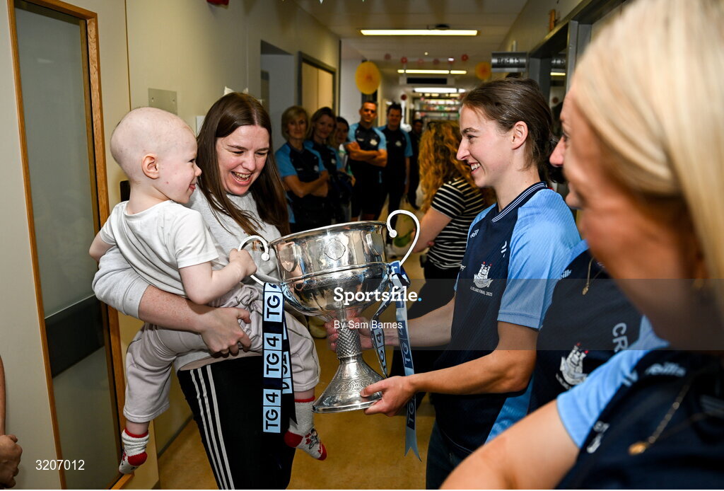 4 August 2025; TG4 All-Ireland Ladies Senior Football Champions and Dublin footballers Orlagh Nolan and Carla Rowe pictured with the Brendan Martin Cup and Saoirse Fearon, aged 4, from Kells, Meath and her mother Laura Fearon, during a visit by the players to Children's Health Ireland at Crumlin, Dublin. Photo by Sam Barnes/Sportsfile