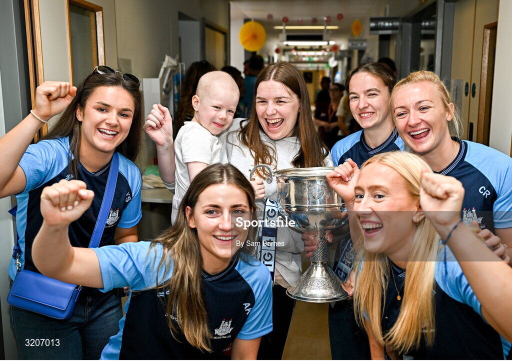 4 August 2025; TG4 All-Ireland Ladies Senior Football Champions Dublin pictured with the Brendan Martin Cup and Saoirse Fearon, aged 4, from Kells, Meath, and her mother Laura Fearon, during a visit by the players to Children's Health Ireland at Crumlin, Dublin. Photo by Sam Barnes/Sportsfile