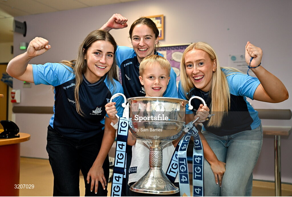 4 August 2025; TG4 All-Ireland Ladies Senior Football Champions and Dublin footballers Aoife Kane, Orlagh Nolan and Jodi Egan pictured the Brendan Martin Cup and Nate Briggs, aged 8, from Dublin, during a visit by the players to Children's Health Ireland at Crumlin, Dublin. Photo by Sam Barnes/Sportsfile