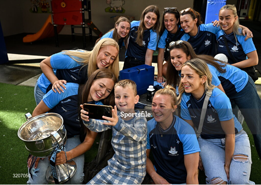 4 August 2025; TG4 All-Ireland Ladies Senior Football Champions Dublin pictured with the Brendan Martin Cup and Shane Comford, aged 7, from Lucan, Dublin, during a visit by the players to Children's Health Ireland at Crumlin, Dublin. Photo by Sam Barnes/Sportsfile