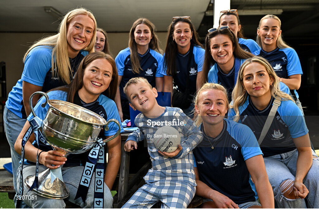 4 August 2025; TG4 All-Ireland Ladies Senior Football Champions Dublin pictured with the Brendan Martin Cup and Shane Comford, aged 7, from Lucan, Dublin, during a visit by the players to Children's Health Ireland at Crumlin, Dublin. Photo by Sam Barnes/Sportsfile