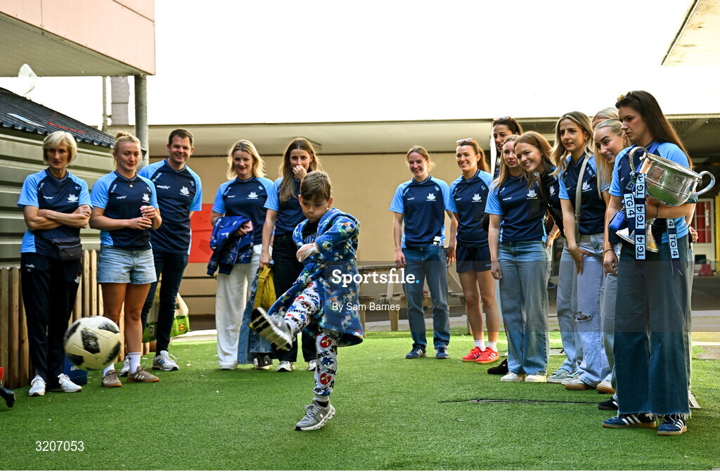 4 August 2025; TG4 All-Ireland Ladies Senior Football Champions Dublin pictured with the Brendan Martin Cup and Dawson Conlon, aged 10, Ballyfermot, during a visit by the players to Children's Health Ireland at Crumlin, Dublin. Photo by Sam Barnes/Sportsfile