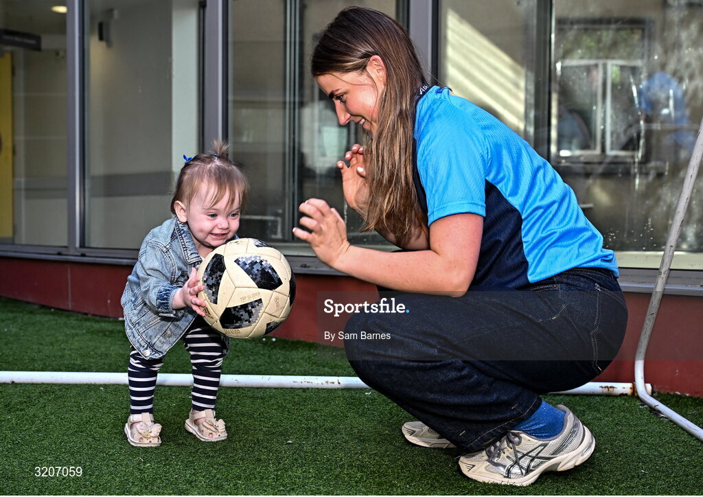4 August 2025; TG4 All-Ireland Ladies Senior Football Champions Dublin footballer Aoife Curran pictured with Aoife Smith, aged 17 months, from Cavan, during a visit by the players to Children's Health Ireland at Crumlin, Dublin. Photo by Sam Barnes/Sportsfile