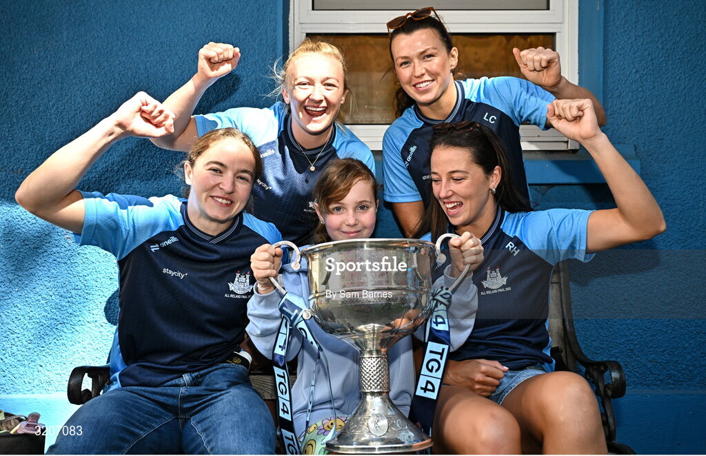 4 August 2025; TG4 All-Ireland Ladies Senior Football Champions Dublin footballers Orlagh Nolan, Carla Rowe, Leah Caffrey and Rachel Hartnett pictured with the Brendan Martin Cup and Katie Brennan, aged 11, from Navan in Meath, during a visit by the players to Children's Health Ireland at Crumlin, Dublin. Photo by Sam Barnes/Sportsfile