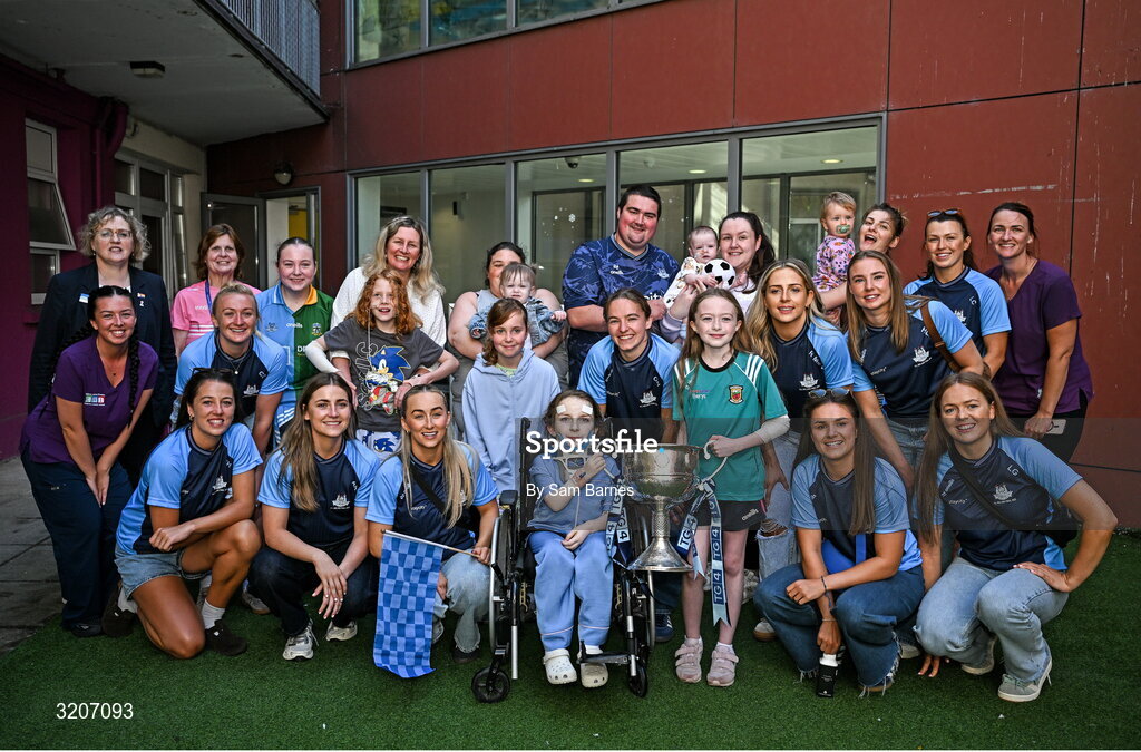 4 August 2025; TG4 All-Ireland Ladies Senior Football Champions Dublin pictured with the Brendan Martin Cup and hospital patients and staff during a visit by the players to Children's Health Ireland at Crumlin, Dublin. Photo by Sam Barnes/Sportsfile