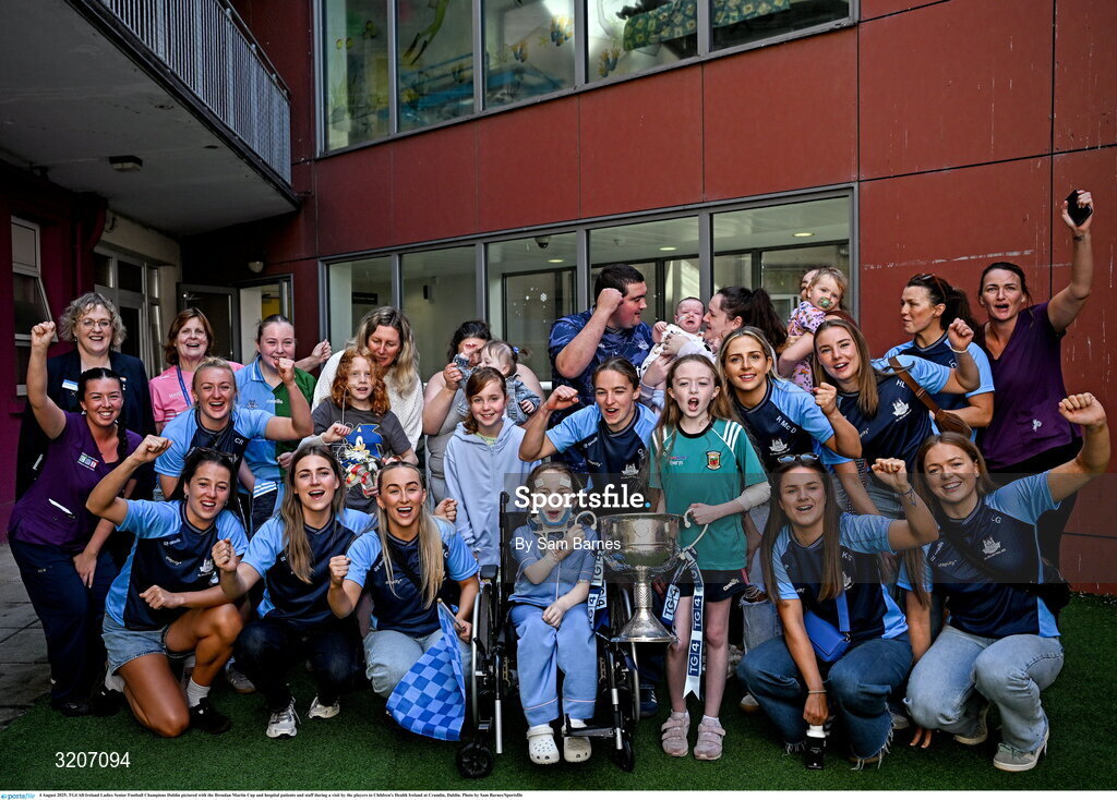 4 August 2025; TG4 All-Ireland Ladies Senior Football Champions Dublin pictured with the Brendan Martin Cup and hospital patients and staff during a visit by the players to Children's Health Ireland at Crumlin, Dublin. Photo by Sam Barnes/Sportsfile