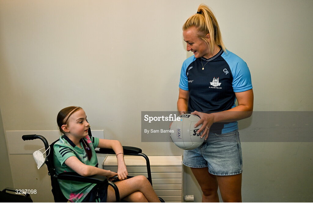 4 August 2025; TG4 All-Ireland Ladies Senior Football Champions Dublin footballer Carla Rowe pictured with Zoe Moore, aged 9, from Ballinteer Dublin, neice of Joint manager Derek Murray, during a visit by the players to Children's Health Ireland at Crumlin, Dublin. Photo by Sam Barnes/Sportsfile