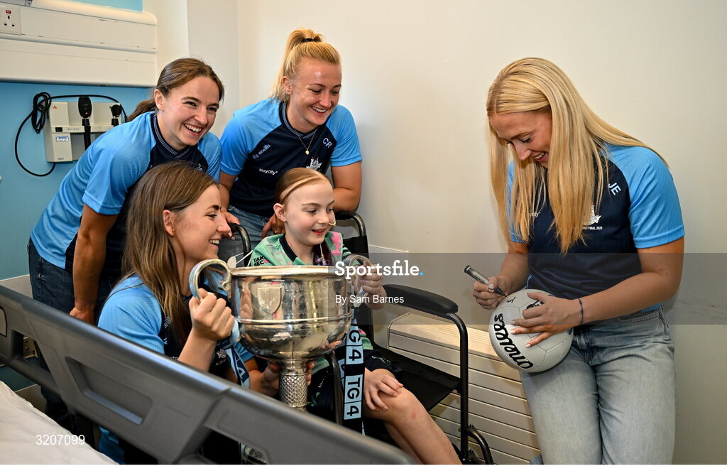 4 August 2025; TG4 All-Ireland Ladies Senior Football Champions Dublin footballers Aoife Kane, Orlagh Nolan, Carla Rowe and Jodi Egan pictured with the Brendan Martin Cup and Zoe Moore, aged 9, from Ballinteer Dublin, neice of Joint manager Derek Murray, during a visit by the players to Children's Health Ireland at Crumlin, Dublin. Photo by Sam Barnes/Sportsfile