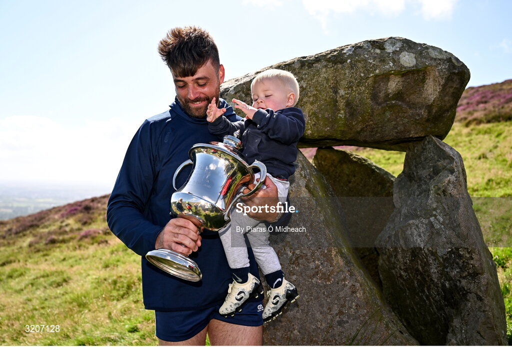 4 August 2025; Senior Hurling winner Colin Ryan of Limerick with his son Fionn and the trophy after the M. Donnelly GAA Poc Fada All-Ireland Finals at Annaverna Mountain in the Cooley Peninsula, Ravensdale, Louth. Photo by Piaras Ó Mídheach/Sportsfile