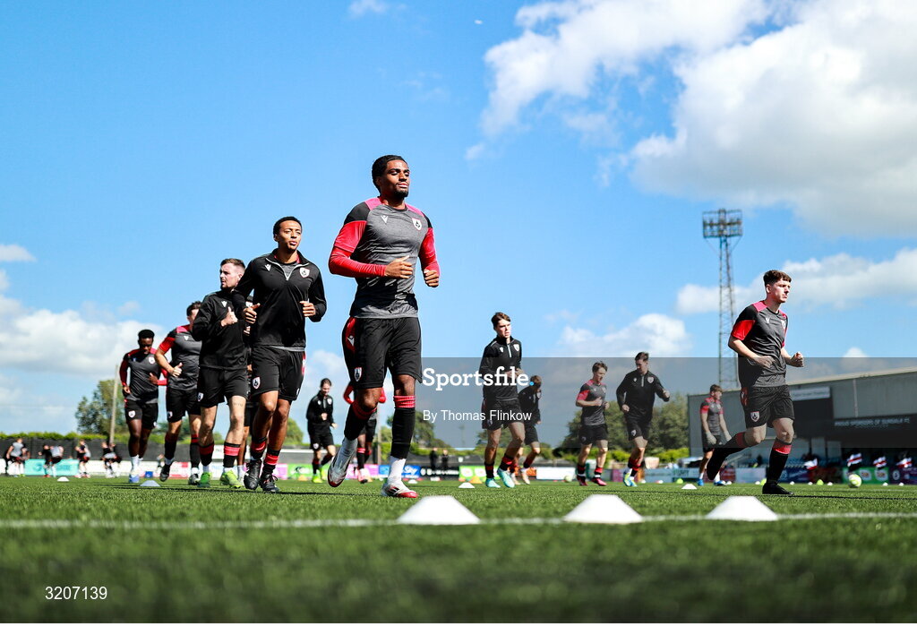 4 August 2025; Longford Town players warm up before the SSE Airtricity Men's First Division match between Dundalk and Longford Town at Oriel Park in Dundalk, Louth. Photo by Thomas Flinkow/Sportsfile