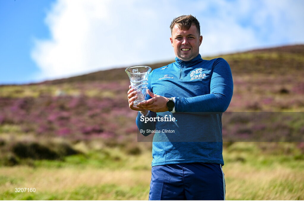 4 August 2025; Killian Phelan of Kilkenny with his trophy after winning the longest puck competition of the M. Donnelly GAA Poc Fada All-Ireland Finals at Annaverna Mountain in the Cooley Peninsula, Ravensdale, Louth. Photo by Shauna Clinton/Sportsfile