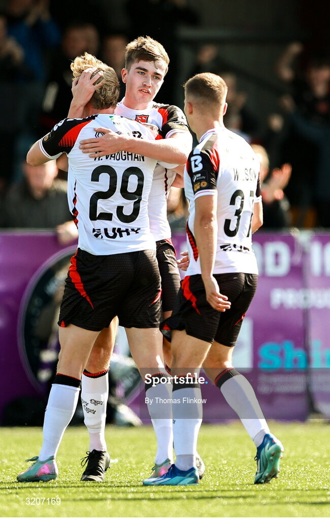 4 August 2025; Eoin Kenny of Dundalk, back, celebrates with teammates, Rohan Vaughan, 29, and John Ross Wilson after scoring his side's first goal during the SSE Airtricity Men's First Division match between Dundalk and Longford Town at Oriel Park in Dundalk, Louth. Photo by Thomas Flinkow/Sportsfile