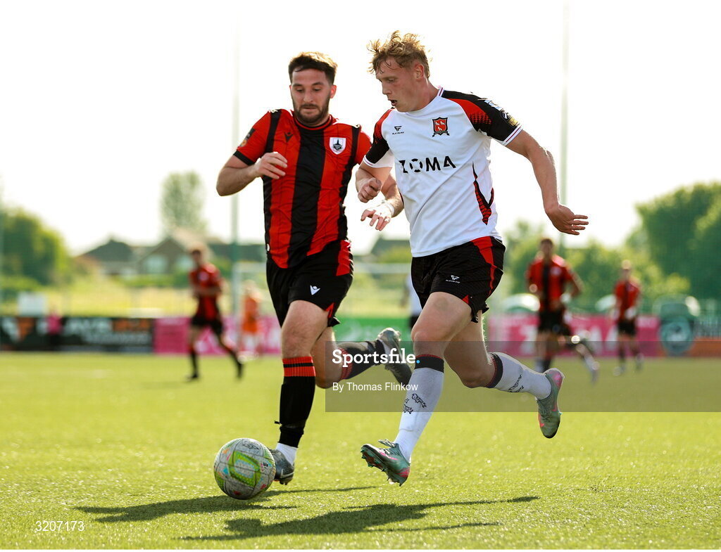 4 August 2025; Rohan Vaughan of Dundalk in action against Andrew Spain of Longford Town during the SSE Airtricity Men's First Division match between Dundalk and Longford Town at Oriel Park in Dundalk, Louth. Photo by Thomas Flinkow/Sportsfile
