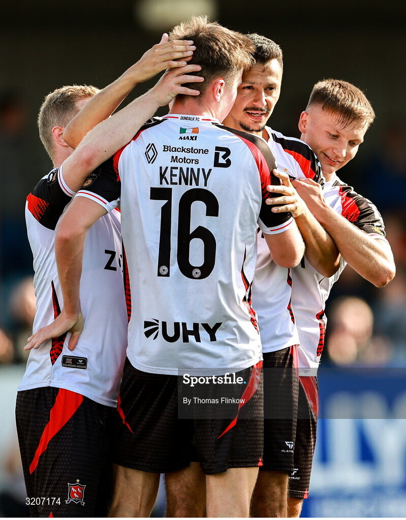 4 August 2025; Dean Ebbe of Dundalk, second from right, celebrates with teammates Daryl Horgan, left, Eoin Kenny, 16, and John Ross Wilson, right, after scoring his side's second goal during the SSE Airtricity Men's First Division match between Dundalk and Longford Town at Oriel Park in Dundalk, Louth. Photo by Thomas Flinkow/Sportsfile