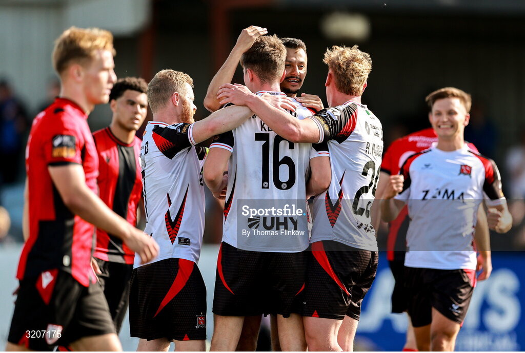 4 August 2025; Dean Ebbe of Dundalk, back, celebrates with teammates Daryl Horgan, left, Eoin Kenny, centre, and Rohan Vaughan, right, after scoring his side's second goal during the SSE Airtricity Men's First Division match between Dundalk and Longford Town at Oriel Park in Dundalk, Louth. Photo by Thomas Flinkow/Sportsfile