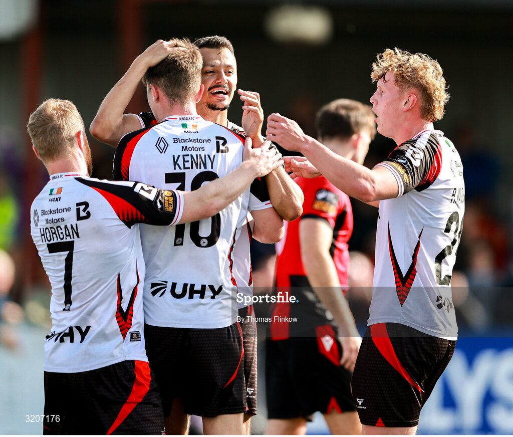4 August 2025; Dean Ebbe of Dundalk, back, celebrates with teammates Daryl Horgan, left, Eoin Kenny, centre, and Rohan Vaughan, right, after scoring his side's second goal during the SSE Airtricity Men's First Division match between Dundalk and Longford Town at Oriel Park in Dundalk, Louth. Photo by Thomas Flinkow/Sportsfile
