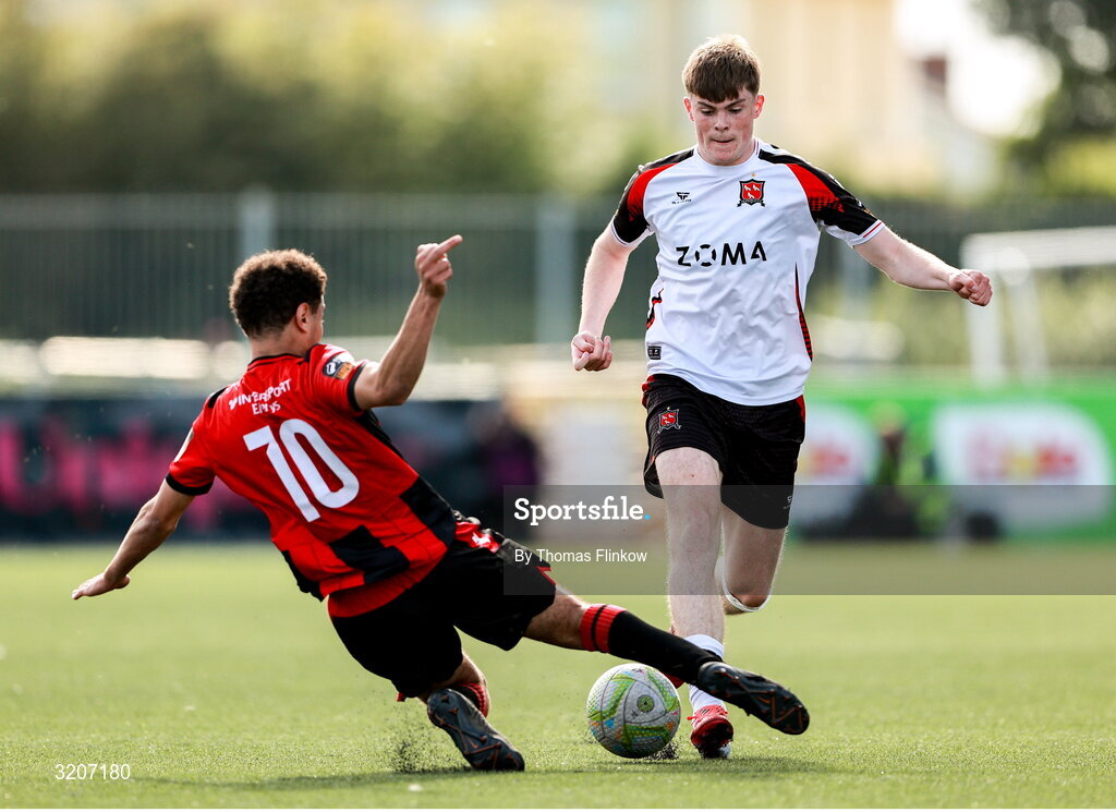 4 August 2025; Vinnie Leonard of Dundalk is tackled by Mohammed Boudiaf of Longford Town during the SSE Airtricity Men's First Division match between Dundalk and Longford Town at Oriel Park in Dundalk, Louth. Photo by Thomas Flinkow/Sportsfile