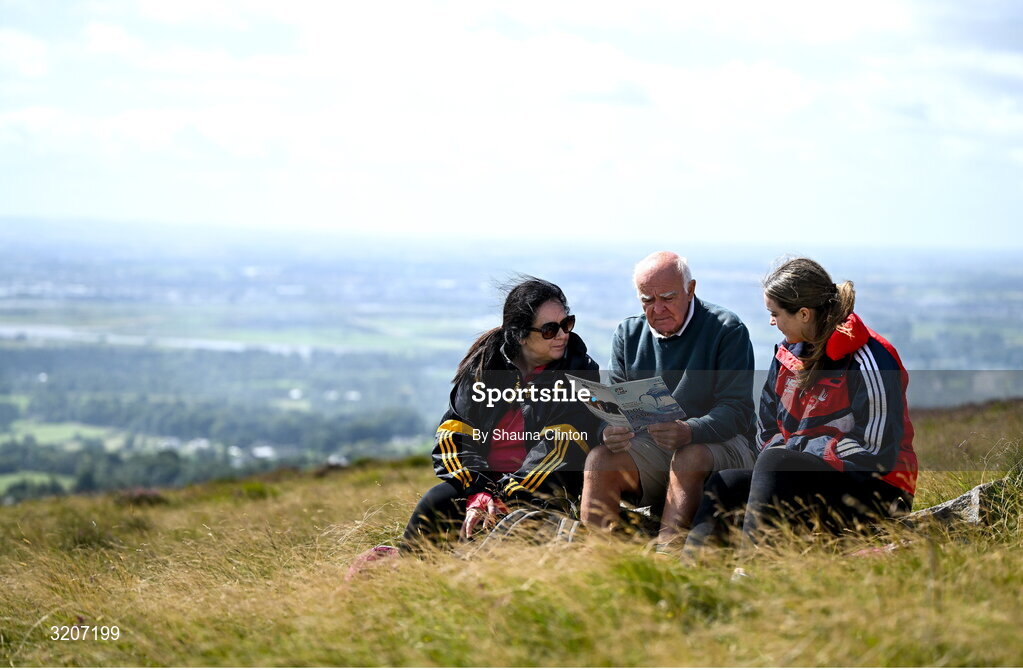 4 August 2025; Spectators, from left, Tanya, Patsy and Kate Murphy inspect the event programme during the M. Donnelly GAA Poc Fada All-Ireland Finals at Annaverna Mountain in the Cooley Peninsula, Ravensdale, Louth. Photo by Shauna Clinton/Sportsfile
