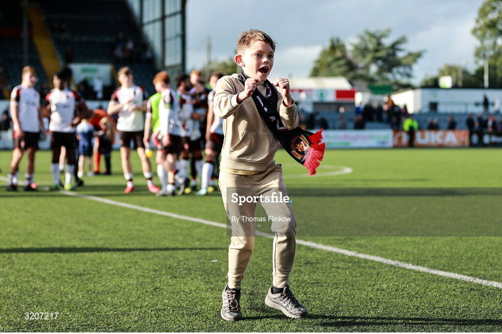 4 August 2025; Dundalk supporter Charlie O'Hegan celebrates after the SSE Airtricity Men's First Division match between Dundalk and Longford Town at Oriel Park in Dundalk, Louth. Photo by Thomas Flinkow/Sportsfile