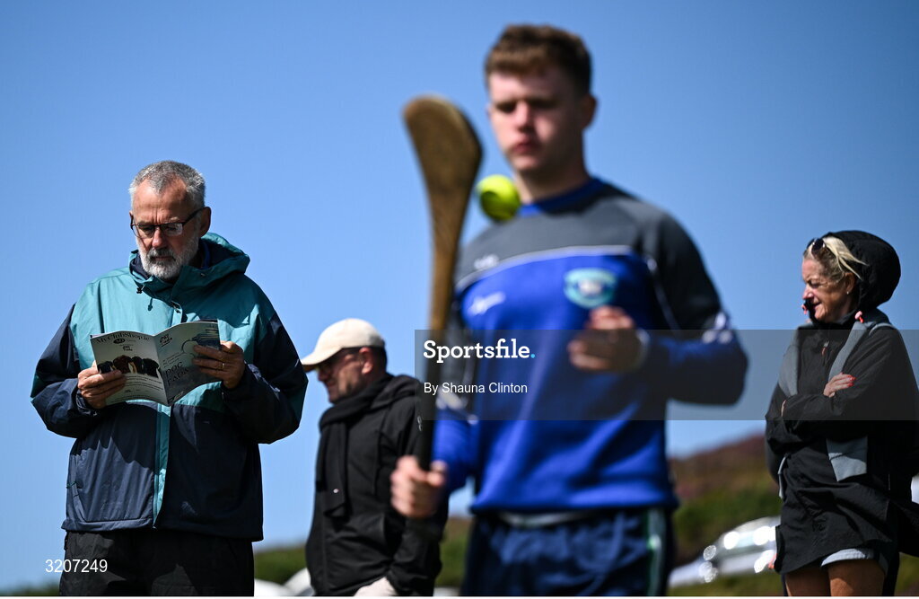 4 August 2025; Iar Uachtarán Chumann Lúthchleas Gael Larry McCarthy, left, inspects an event programme as Sean Og O'Regan of Waterford competes in the Hurling Under 16 competition during the M. Donnelly GAA Poc Fada All-Ireland Finals at Annaverna Mountain in the Cooley Peninsula, Ravensdale, Louth. Photo by Shauna Clinton/Sportsfile