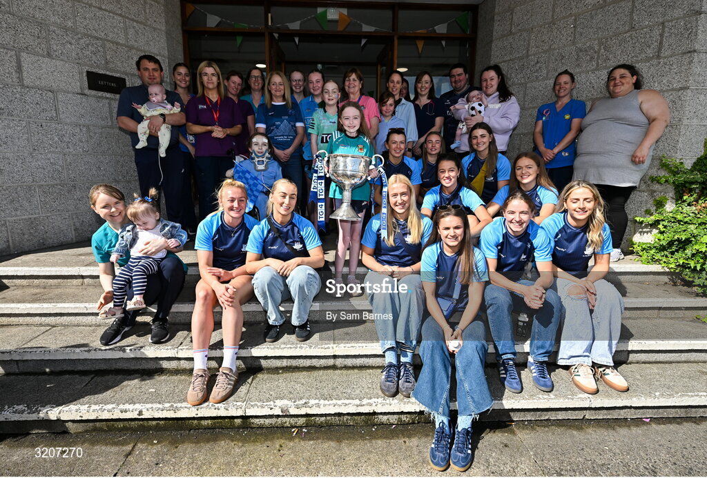 4 August 2025; TG4 All-Ireland Ladies Senior Football Champions Dublin pictured with the Brendan Martin Cup and hospital staff and patients during a visit by the players to Children's Health Ireland at Crumlin, Dublin. Photo by Sam Barnes/Sportsfile