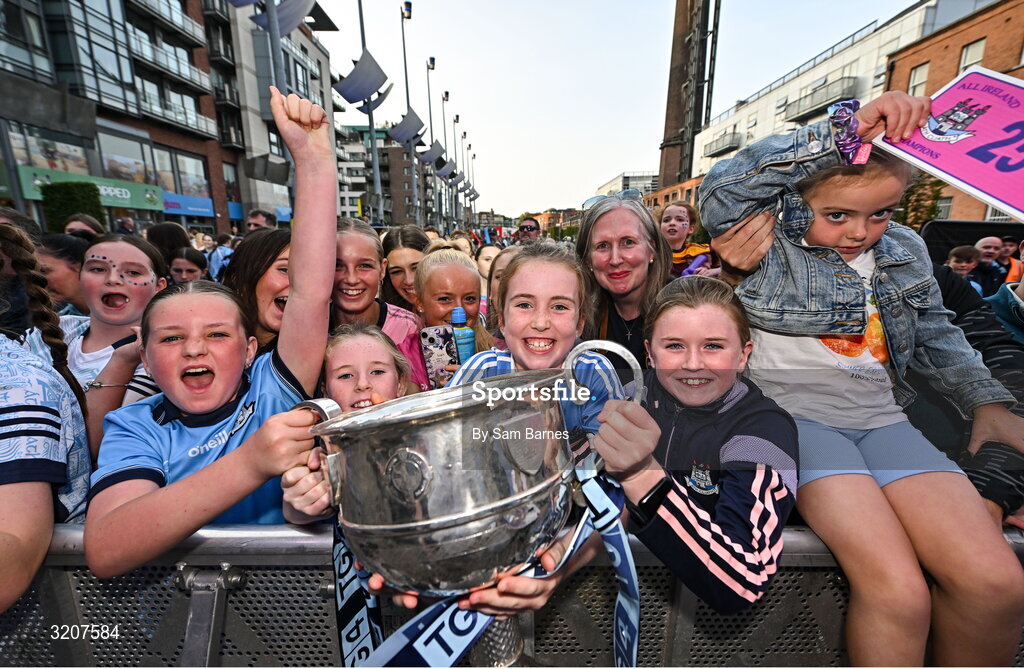 5 August 2025; Supporters with The Brendan Martin Cup during the homecoming of TG4 All-Ireland Ladies Senior Football Champions, Dublin, at Smithfield Square in Dublin. Photo by Sam Barnes/Sportsfile