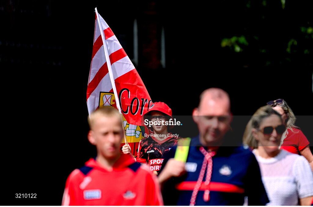 10 August 2025; Cork supporters arrive before the Glen Dimplex All-Ireland Senior Camogie Championship final match between Cork and Galway at Croke Park in Dublin. Photo by Ramsey Cardy/Sportsfile