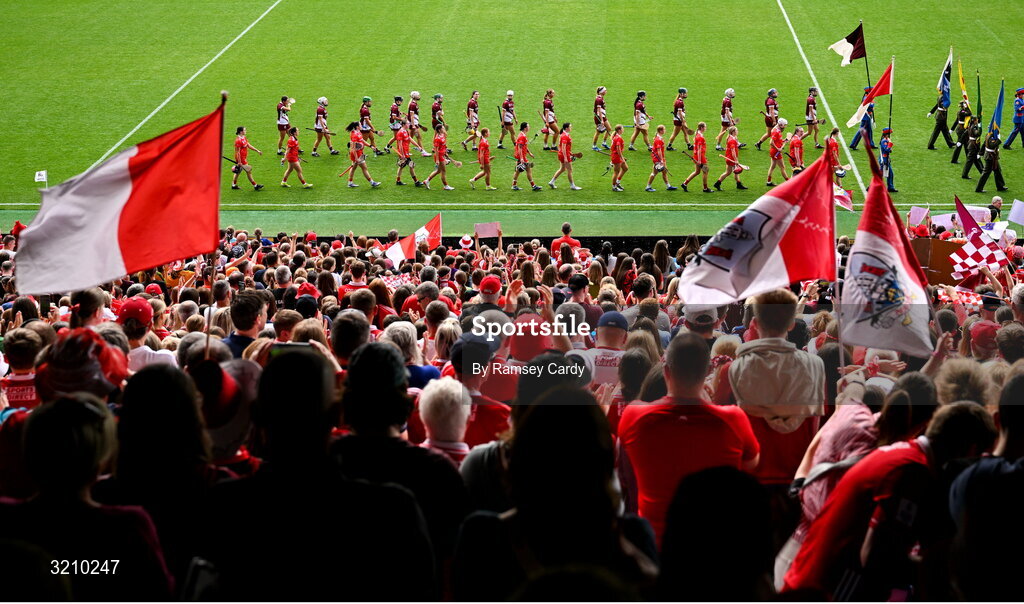 10 August 2025; The Cork and Galway teams parade behind The Artane Band before the Glen Dimplex All-Ireland Senior Camogie Championship final match between Cork and Galway at Croke Park in Dublin. Photo by Ramsey Cardy/Sportsfile